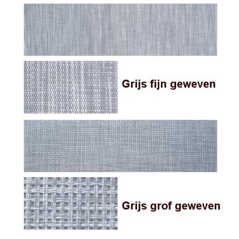U kunt kiezen uit een fijn- of grofgeweven bekleding. De fijngeweven bekleding is dicht en ondoorzichtig. De grofgeweven bekleding is meer open en daardoor enigszins doorzichtig, maar minstens zo sterk. De zonneklep is altijd voorzien van een fijngeweven bekleding (zie voor meer detail bij de afbeeldingen).