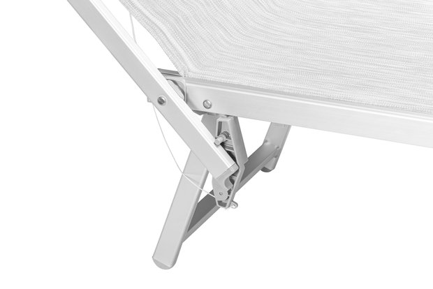 De rugleuning is voorzien van een ingenius, onverwoestbaar en uniek systeem om deze in 3 standen te kunnen zetten. Het ligbed kan ook helemaal plat. U kunt dan de zonneklep nog als boekenleesplank gebruiken.